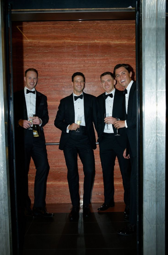 Мужчины — черный пиджак и бабочка, белая рубашка. Девушки — черное вечернее или коктейльное элегантное платье.
